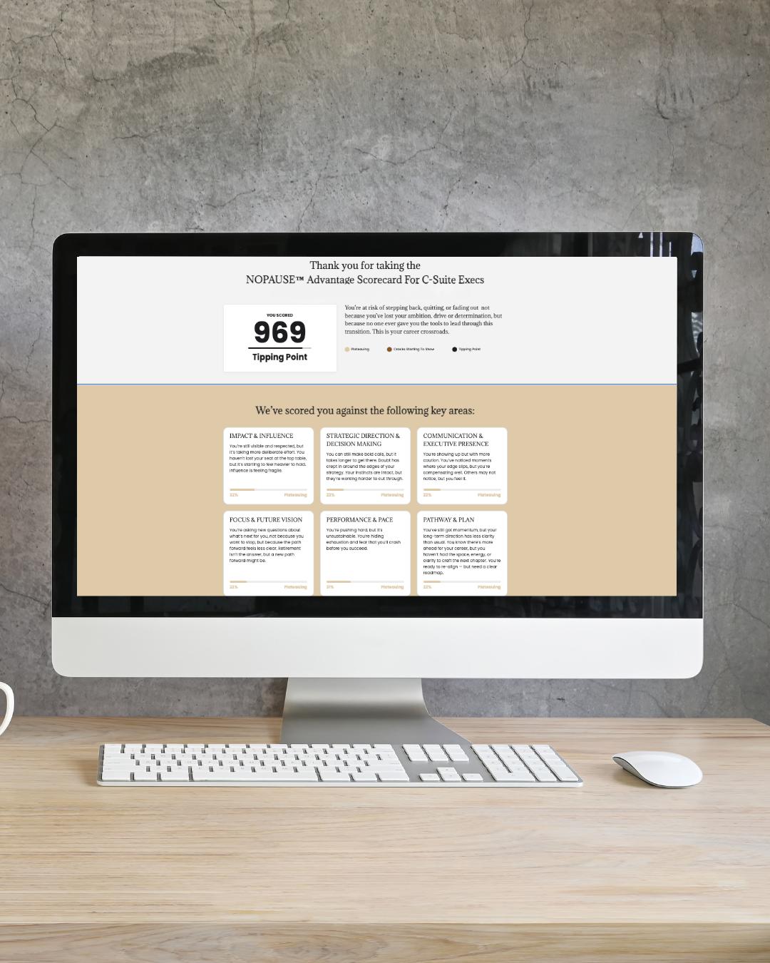 In just 5 minutes, you’ll answer a series of powerful questions designed to reveal how equipped you are to sustain your performance, pace, and executive edge in the C-suite through menopause.